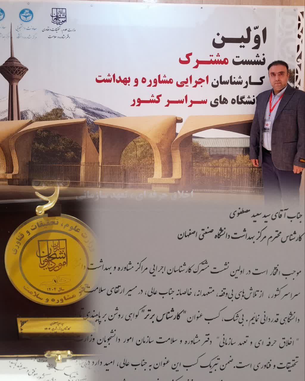 آقای سیدسعید مصطفوی کارشناس مرکز بهداشت دانشگاه صنعتی اصفهان، عنوان کارشناس برتر کشور را کسب کرد
