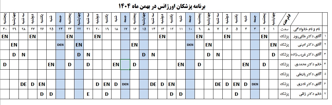 درمانگاه شبانهروزی پزشکان عمومی برنامه ماهانه پزشکان عمومی دكتر محسن امينیهرندی پزشک عمومی 33912949 - 33912954 شماره اتاق : 3 دكتر منصور ملكیپور پزشک عمومی 33912954 - 33912949 شماره اتاق : 3 دکتر سیدحمیدرضا غریبزاده پزشک عمومی 33912949 - 33912954 شماره اتاق : 3 پزشکان عمومی برنامه ماهانه برنامه پزشکان بهمن ماه 1404 برنامه ماهانه